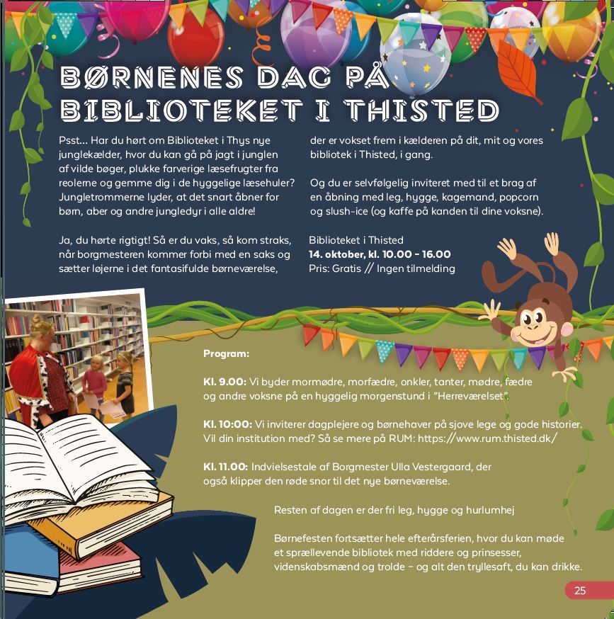 Vi indbyder til fest og leg i Junglekælderen på biblioteket i Thisted den 14. oktober mellem 10-14! Vi fejrer åbningen af den nyindrettede junglekælder med popcorn, slush-ice, sjov og ballade.