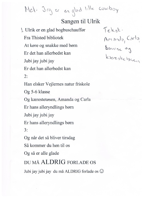 På bogbussens tur sidste tirsdag fik de besøg af nogle søde piger fra Vejlernes Naturfriskole. De medbragte en guitar og en hjemmelavet sang til deres bogbuschauffør. Den blev opført i fineste stil, så næsten ikke et øje var tørt.